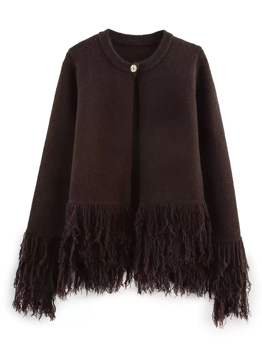 One-Button Stylish Fringed Details Sweater